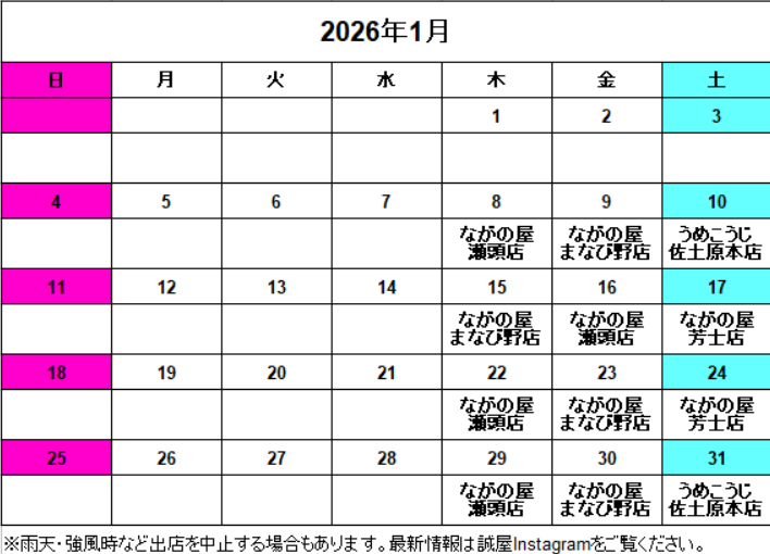 1月の出店予定